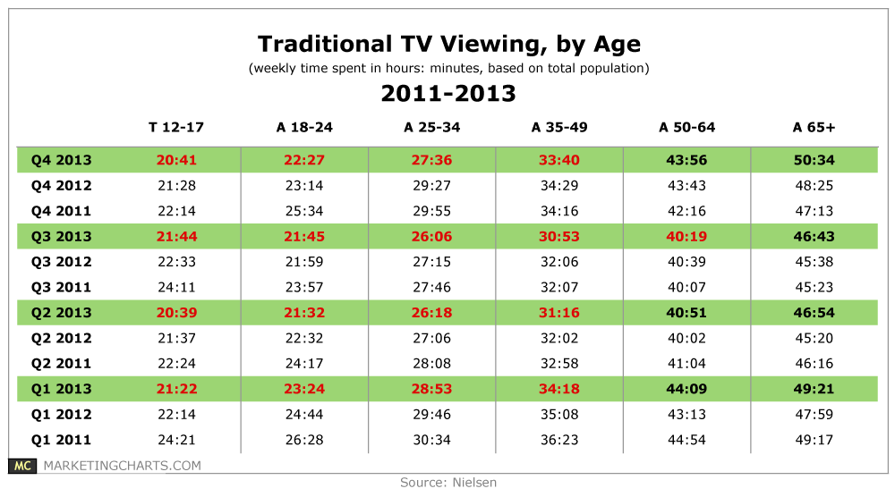 ¿Qué está pasando? Parece que a los chicos, la tele les gusta cada vez menos. Las últimas cifras de Nielsen lo demuestran: en el último trimestre de 2013, los americanos con edades de entre 18 y 24 años consumían 22 horas y media por semana de TV. Un año antes, veían 47 minutos más que esto y, dos años antes, dos horas más. Tres horas menos significa que ven una sitcom entera menos. Menos audiencia, menos ingresos por publicidad. Debajo les dejo el chart en cuestión, gentileza de Marketing Charts.